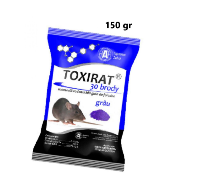 TOXIRAT MOMEALA SOARECI GRAU 150G este un produs realizat pentru combaterea rozatoarelor(soareci, sobolani) cu o actiune intarziata pentru un eficienta cat mai mare a produsului. Momeala este realizata sub forma unui grau albastru care contine o substanta activa foarte ispititoare pentru rozatoare. Momeala contine o substana foarte amara care sa previna consumul accidental al omului sau al animalelor de curte.