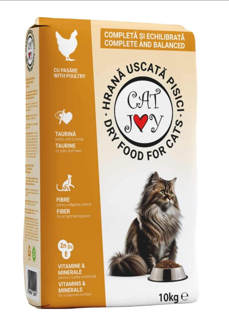 Hrana uscata pentru pisici CAT JOY cu PUI 10kg este o hrana completa si perfect echilibrata sub forma uscata ideala pentru pisicile cu activitate normala, cat si pentru pisicile care locuiesc predominant in casa.